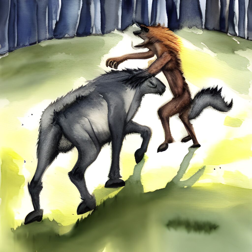 The werewolf attacked, but the donkey was ready for him. With quick thinking and agility, the donkey managed to grab the werewolf’s tail and start dragging him around the meadow. The werewolf was caught off guard and struggled to break free, but the donkey was too strong.