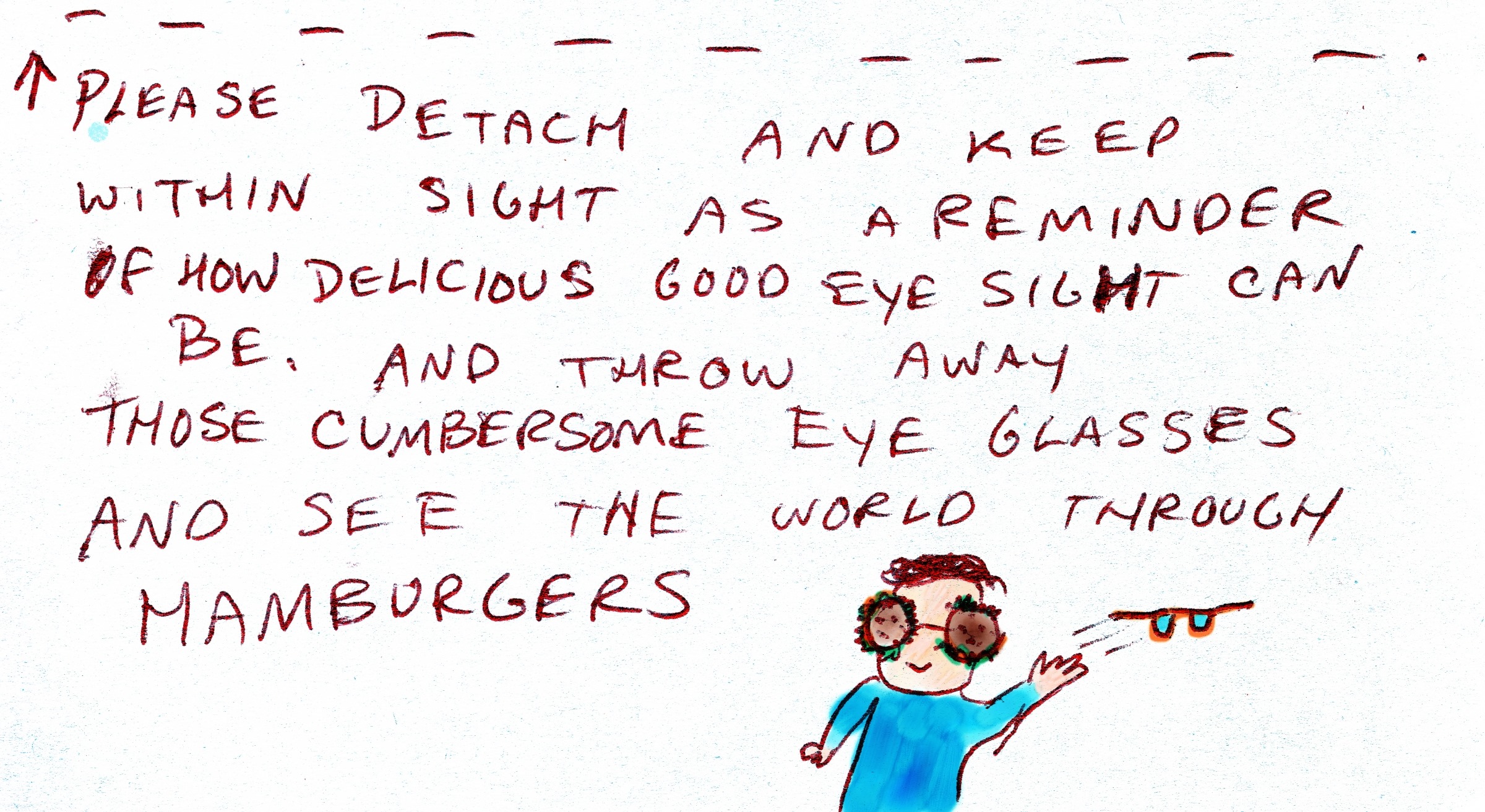 Please detach and keep within sight as a reminder of how delicious good eye sight can be, and throw away those cumbersome eye classes and see the world through hamburgers